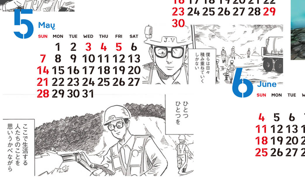 表面は、主人公の“オイちゃん”以外にも、土木業界で働く職人たちの表情、言葉を数多く採用したデザイン。「普段なにげなく見ている橋や高速道路の向こうに“造った人”が想像できる…そんな漫画にできたらいい」という羽賀翔一のコメントの通り、日々の生活を支えてくれるプロフェッショナルの気配が伝わってくるようなカレンダーです。